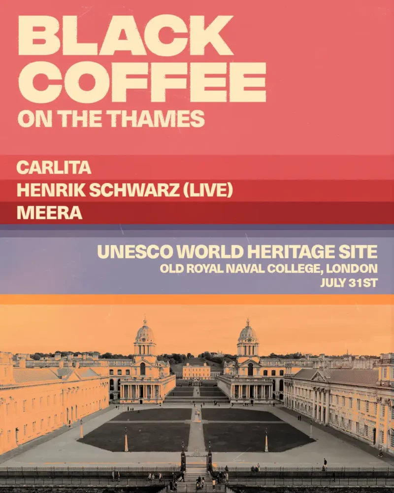 Taking place on Wednesday, July 31st and Thursday, August 1st, the events feature two distinct lineups. Night one includes Carlita, Henrik Schwarz (Live), and Meera, while the second night welcomes Maz and a B2B set from Manoo and Fiona Kraft. Both evenings will see Black Coffee curate his own support and bring custom production to the riverside setting.