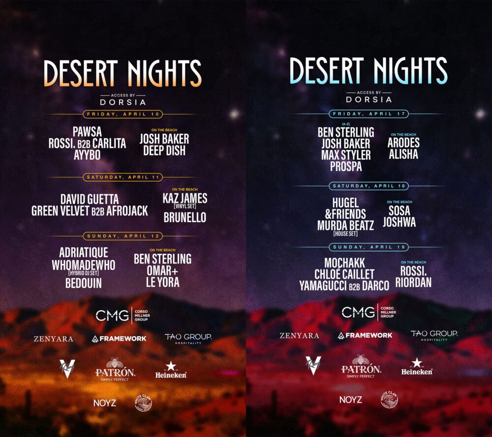 Corso Millner Group and Framework have announced the full lineup for Desert Nights 2026. The invite-only event series returns to the Zenyara estate in Coachella Valley from April 10–12 and April 17–19.