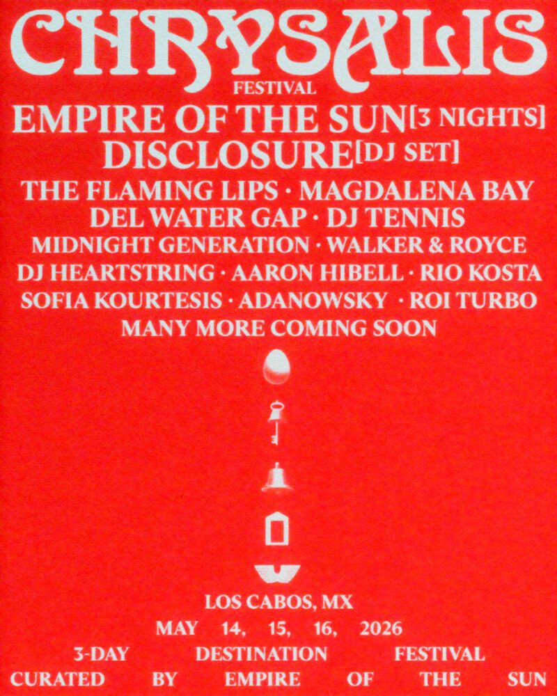 Empire of the Sun have announced the debut edition of Chrysalis, a three-day destination festival taking place May 14th–16th, 2026, at The Sculpture Gardens in San Jose del Cabo, Baja California. Presented in partnership with 100x Hospitality, the event features over 25 artists, immersive environments, and three headline performances by the Australian duo.