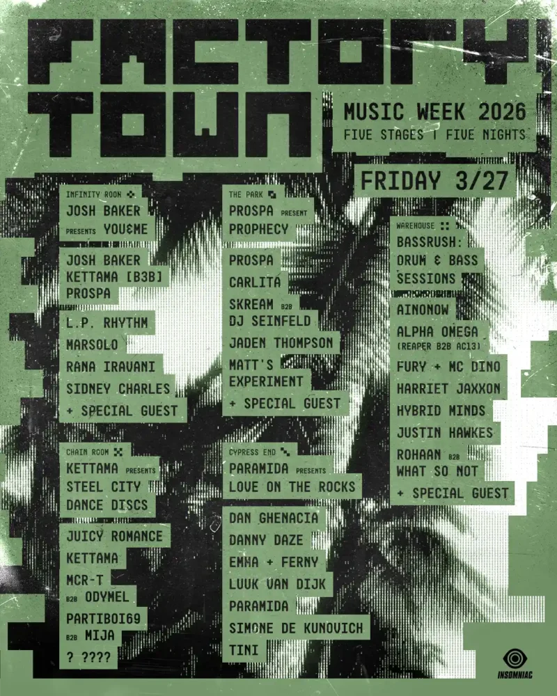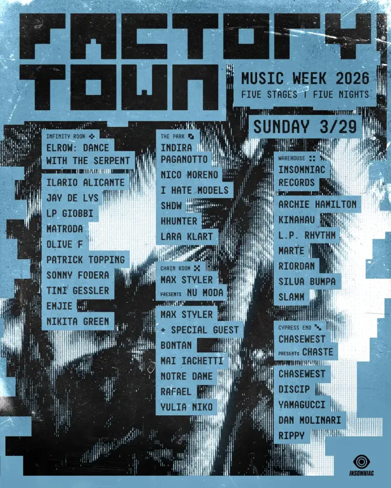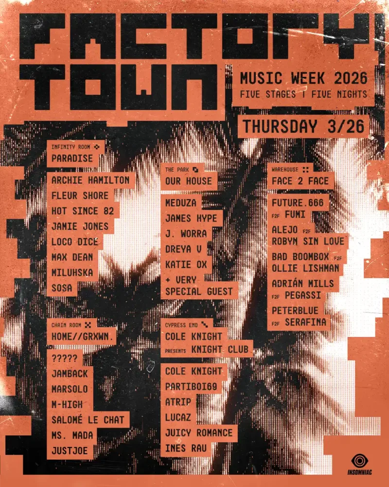 Factory Town has unveiled its day-by-day programming for Miami Music Week 2026, running from Wednesday, March 25th, through Sunday, March 29th. Presented by Insomniac, the five-night series spans five stages across the Hialeah venue, bringing together a wide cross-section of underground and global electronic talent.