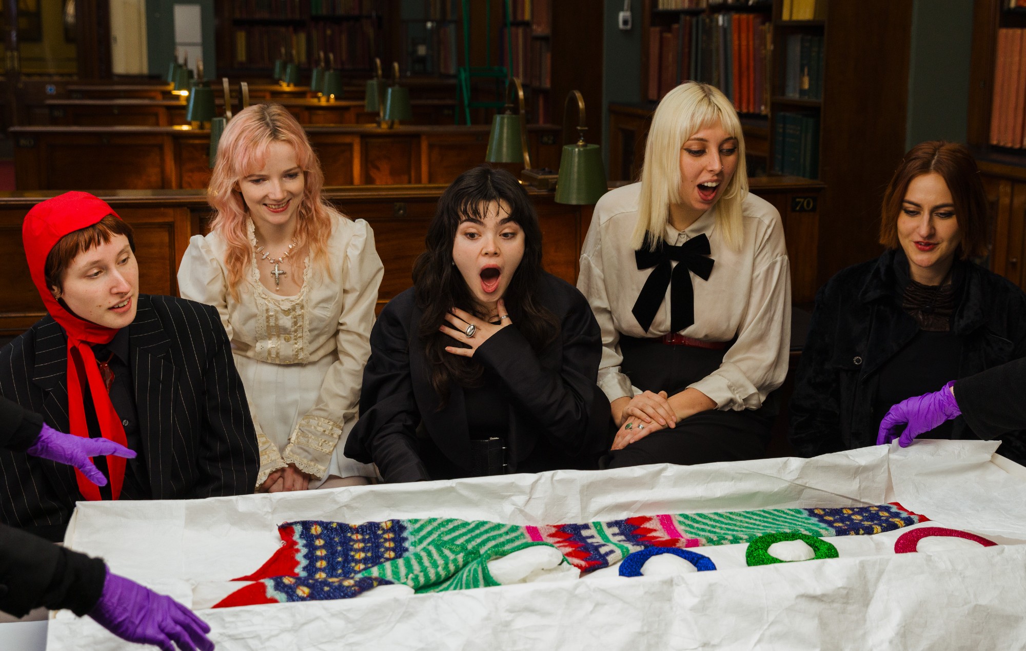 The Last Dinner Party unboxing one of David Bowie’s items. Credit: Timothy Eliot Spurr for the Victoria and Albert Museum