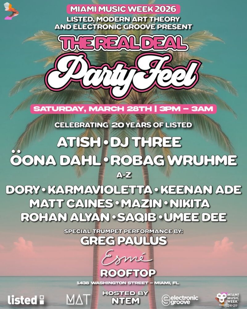 Listed, Modern Art Theory, and Electronic Groove are coming together for a special Miami Music Week edition of The Real Deal Party Feel, set to take over Esmé Rooftop on Saturday, March 28th, 2026.