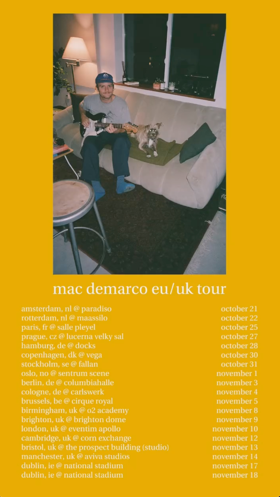 The pre-sale for Mac DeMarco’s 2025 tour dates is schedule to kick off on April 9 at 10 am local time. The public sale will follow on April 10 at 10 am local time. Find more information here. Continue below to view Mac DeMarco’s view tour schedule and posters.